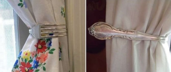 Des supports élégants pour rideaux de cuisine sont obtenus à partir de couverts ordinaires: fourchettes, cuillères, tasses. Pour les fabriquer, il suffit de plier une fourchette ou une cuillère et de les fixer au mur, de couper le fond des tasses et de les suspendre par les poignées à des crochets fixés au mur. Les appareils en métal peuvent tenir des rideaux serrés. Les tasses en porcelaine et en faïence ne peuvent contenir que du tulle avec des rideaux lumineux.