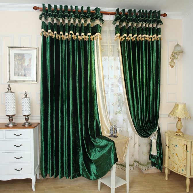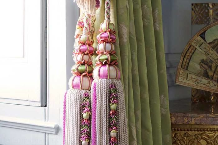 Le plus souvent, les rideaux lourds sont décorés de franges; dans de tels cas, une tresse épaisse et volumineuse est plus appropriée. Par exemple, un rideau en velours vert foncé, bordé de franges à pampilles dorées, est magnifique.