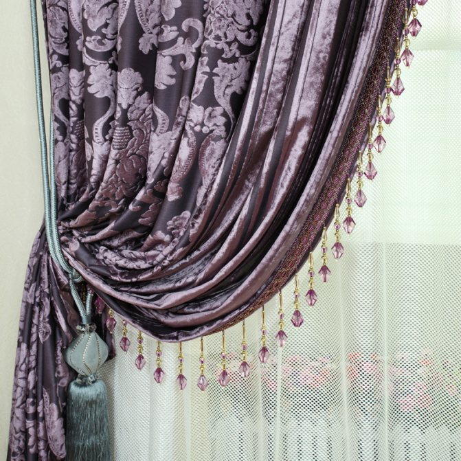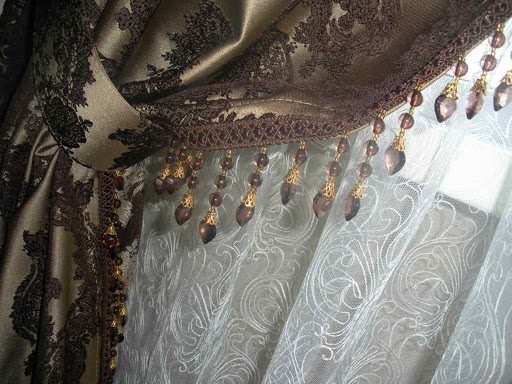 Pour les rideaux en mousseline de soie ou en organza, ainsi que pour les rideaux en tissus légers (satin, soie), des franges avec des perles en plastique léger et bon marché conviennent, incl. transparent, imitant le verre. Une option intermédiaire est les perles de clairon, qui sont de minces tubes courts en verre coloré qui peuvent être enfilés sur un fil. Les options les plus chères pour les intérieurs d'élite sont en cristal, qui scintille de toutes les couleurs de l'arc-en-ciel sous un éclairage artificiel.