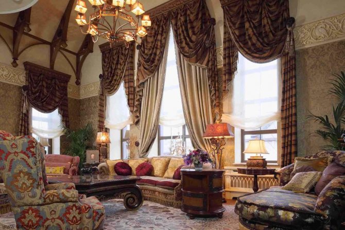 Le style de l'intérieur joue un rôle prépondérant dans le choix des bijoux. Dans les projets de design des tendances modernes, on ne peut pas trouver de lourds rideaux garnis de franges. Et pour le style oriental standard ou baroque, c'est typique. Par conséquent, il est nécessaire de dresser des rideaux en tenant compte des principes généraux du style intérieur choisi.
