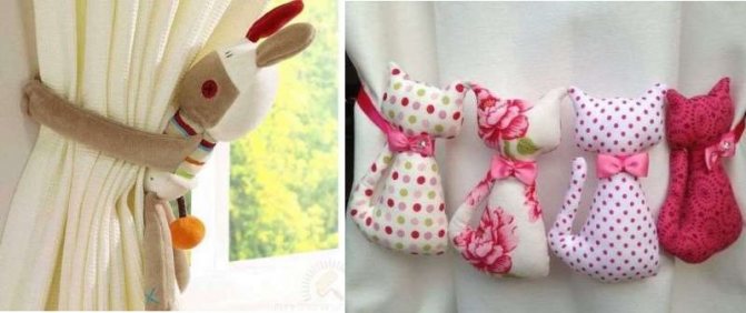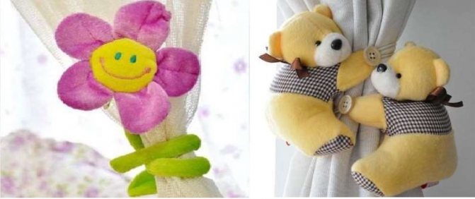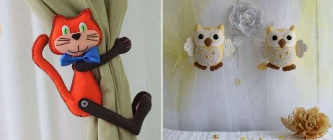 Des jouets mignons en feutre ou en peluche, des rideaux étreignant - la décoration parfaite pour les crochets de rideaux dans la chambre d'enfant.Ils peuvent être drapés sur le tissu, en le tenant avec de longues jambes nouées, avec une queue dans laquelle le fil est inséré, cousue sur une bande pour rideaux en ruban de satin, attachée à des supports magnétiques, des boutons.