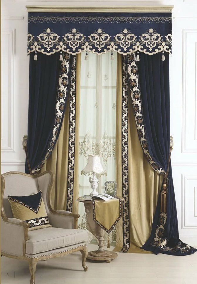 Le style Empire élite aidera à créer une lourde frange sur des rideaux de velours décorés de lambrequins. Un bleu apaisant est une bonne couleur pour la chambre et peut être décoré de franges dorées.