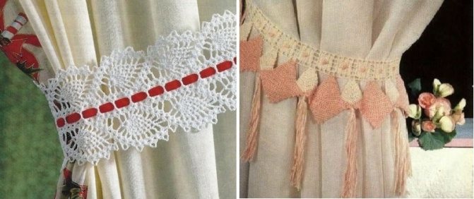 La jarretière est nouée de différentes manières. Le plus courant est lorsqu'un crochet ou un anneau est fixé au mur, auquel sont attachés deux lacets décoratifs avec des pompons aux extrémités. Ces cordons nouent les rideaux des deux côtés par un simple nœud double. Pour une plus grande décoration, les toiles nouées sont décorées de fleurs artificielles cousues, de broches épinglées et nouées avec une belle tresse. Une telle prise est bonne esthétiquement, mais pas pratique si les rideaux sont souvent utilisés, fermés et ouverts.