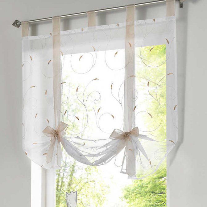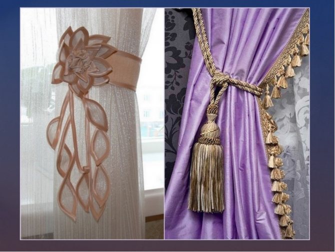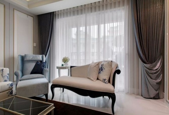 Par exemple, vous pouvez utiliser des rideaux en organza blanc comme neige, assemblés avec des grappins verticaux en satin ou en soie. Ils rassemblent le bord inférieur du rideau en de subtils plis semi-circulaires.
