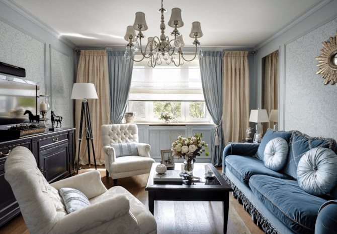 Si nous parlons d'un design d'intérieur classique, alors dans la conception des fenêtres, il est préférable de remplacer les stores par du tulle à motifs dense associé à des rideaux occultants - par exemple, comme sur cette photo.