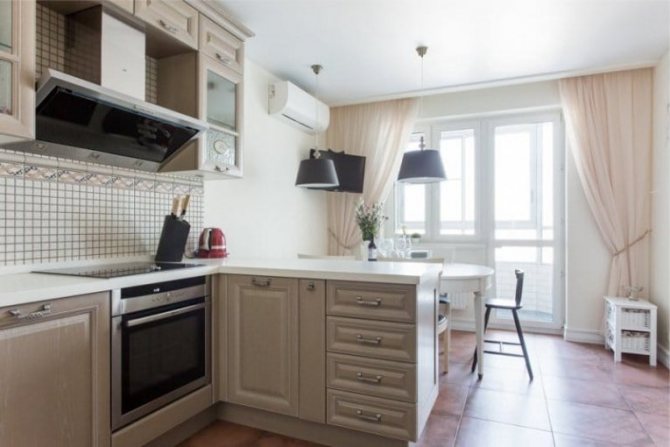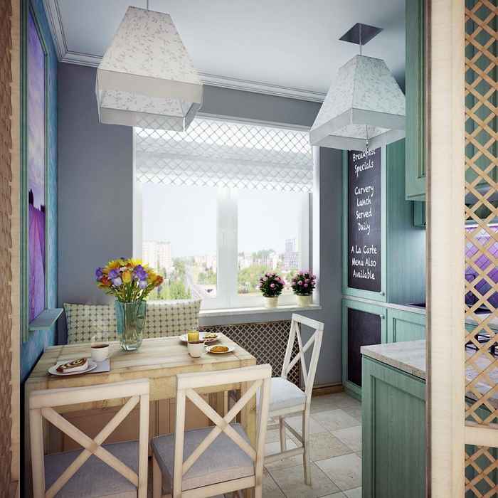 Si vous avez une table près de l'ouverture de la fenêtre, vous ne devez pas y suspendre de rideaux au sol. Il est préférable de s'attarder sur un modèle demi-fenêtre et un lambrequin rigide en matériau uni ou coloré. Une telle fenêtre aura l'air très intéressante et inhabituelle.