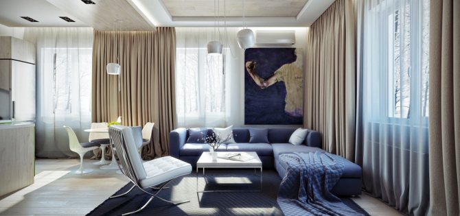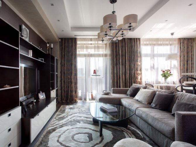 Un salon avec une baie vitrée initie les idées de design les plus intéressantes, cependant, certaines difficultés surviennent avec la conception des fenêtres. Parfois, il est possible de prendre plusieurs rideaux courts pour le tulle et les rideaux - mais cela n'est possible qu'avec de grandes distances entre les ouvertures.