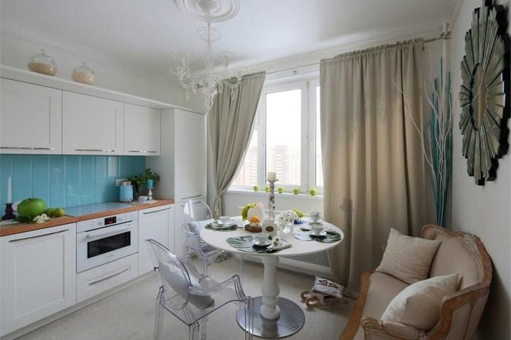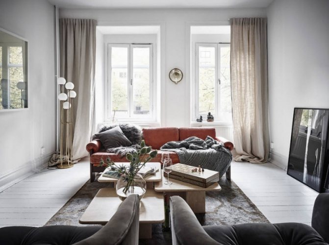 - n'utilisez pas de poignées, lambrequins et autres décorations qui ajouteront du volume inutile aux rideaux. Accrochez des toiles droites. Il est possible d'utiliser un ornement de taille moyenne;
