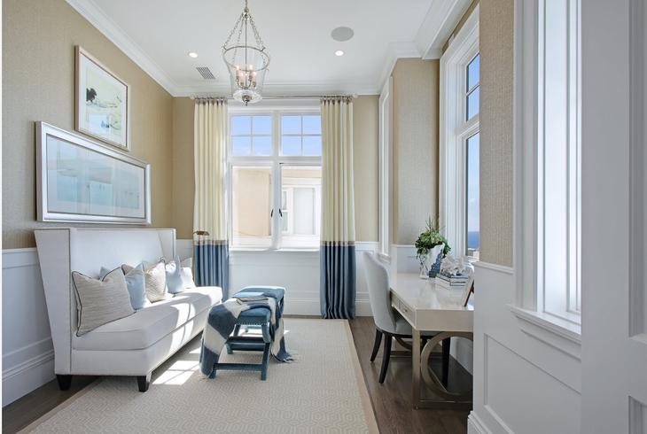 - si vous souhaitez accentuer l'ouverture de la fenêtre, utilisez des tissus saturés de la même couleur ou avec des rayures horizontales pour la draperie. Dans ce cas, le nombre de couleurs sur la toile ne doit pas dépasser deux. Par exemple, cela peut être une combinaison d'aqua et de ton doré;
