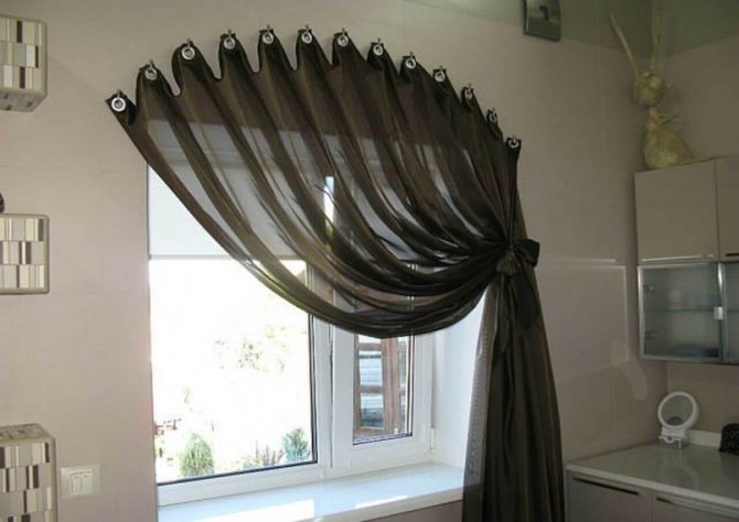 Les rideaux courts restent à la mode, mais ils sont cousus dans l'attente d'une draperie latérale: les rideaux se lèvent comme des rideaux romains à travers des anneaux ou à l'aide d'un cordon de serrage. Ainsi, pendant la journée, il ne reste qu'un semblant de lambrequin du rideau, ce qui forme l'apparence du design moderne de la fenêtre de la cuisine.