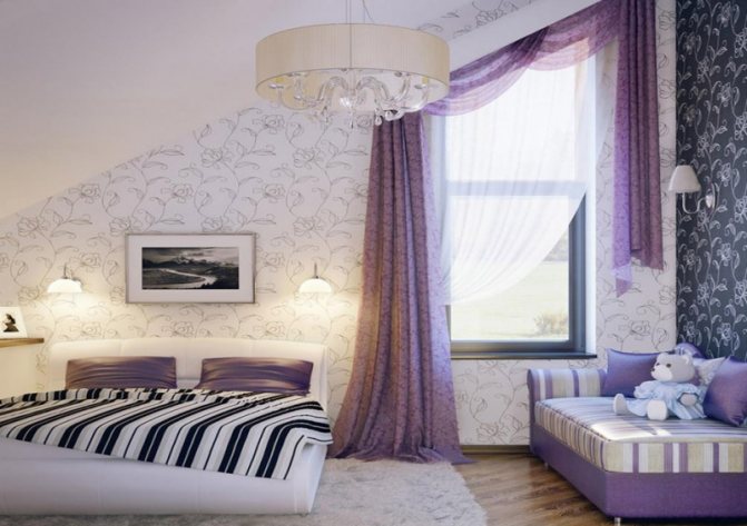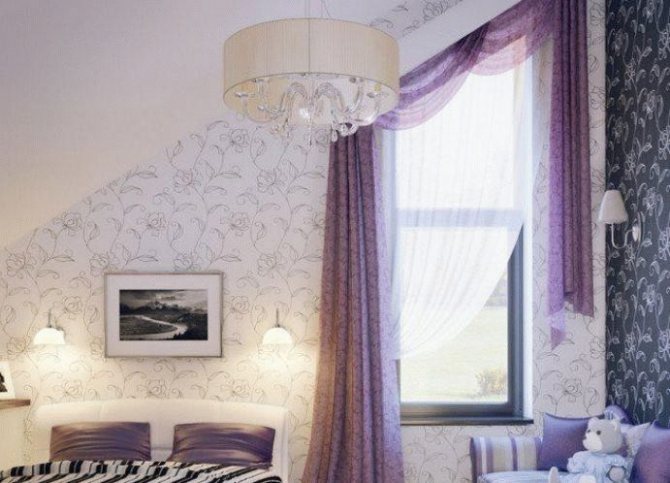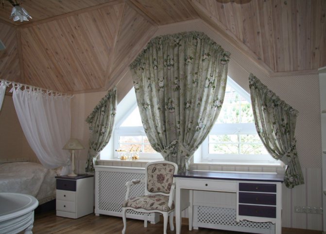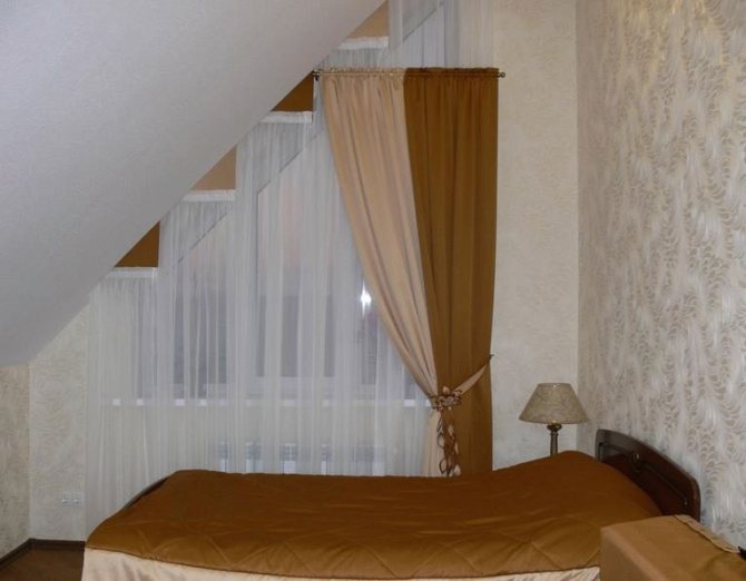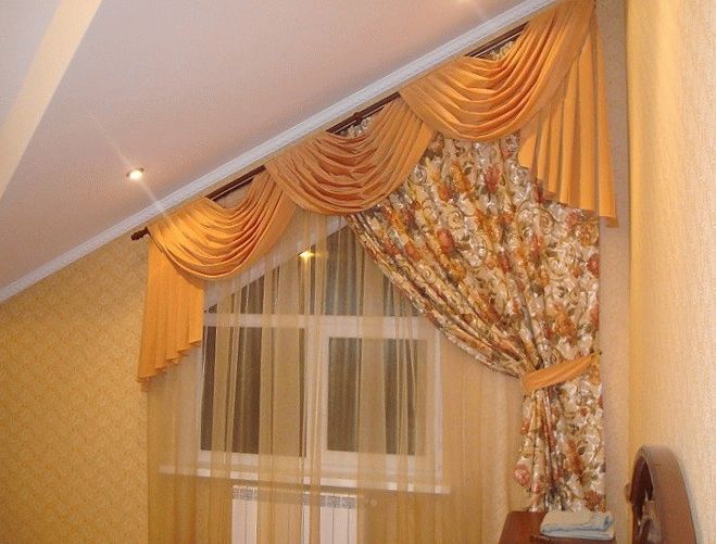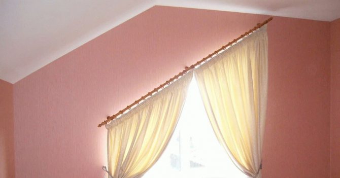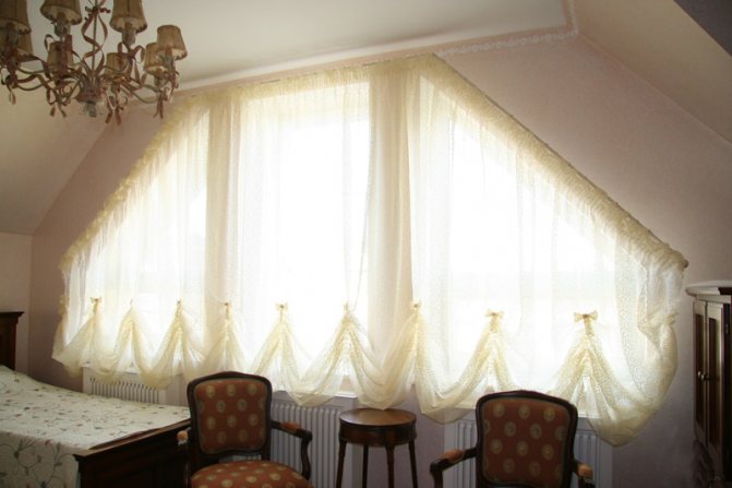 Une des conditions pour la décoration réussie d'une pièce avec des rideaux sur des fenêtres inclinées est la conformité de la manière de leur exécution avec les caractéristiques générales de l'intérieur.
