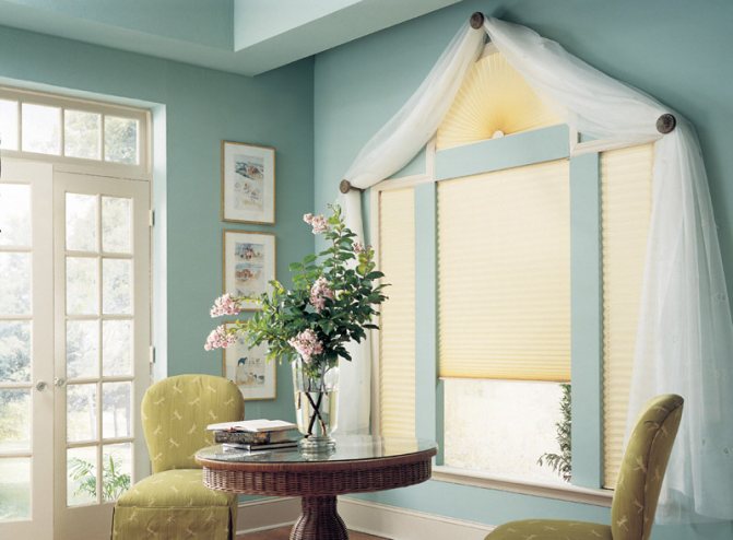 Une solution originale pour les fenêtres rondes - les rideaux plissés, qui peuvent être utilisés pour les fenêtres de toutes formes et tailles géométriques