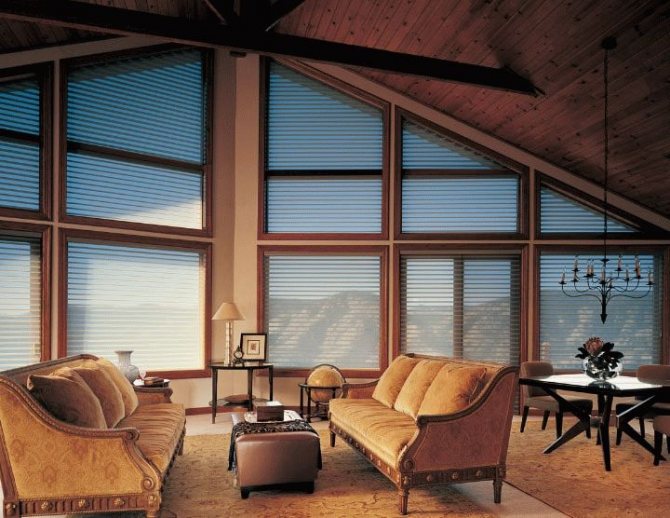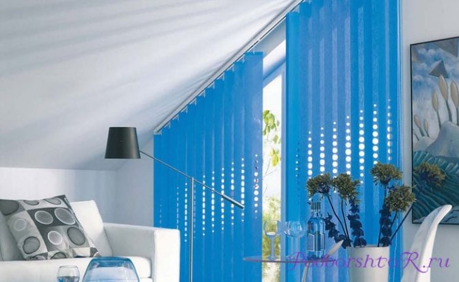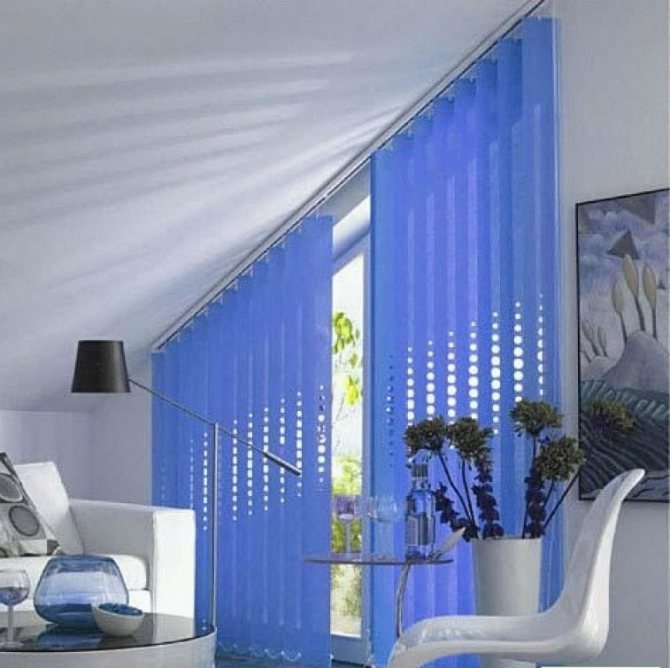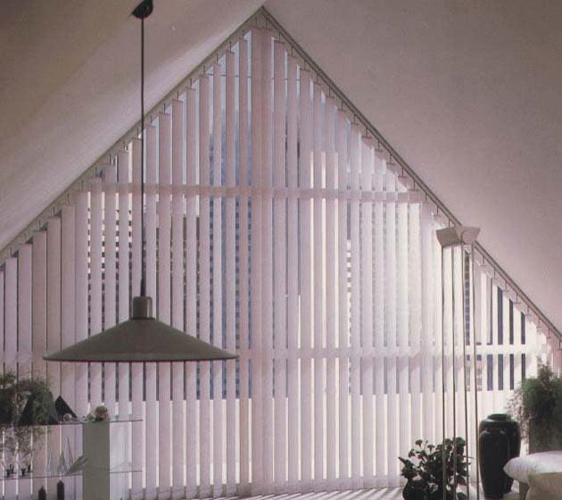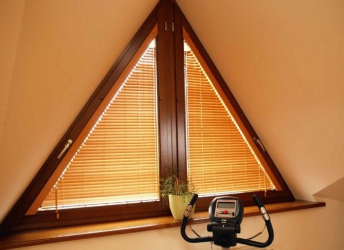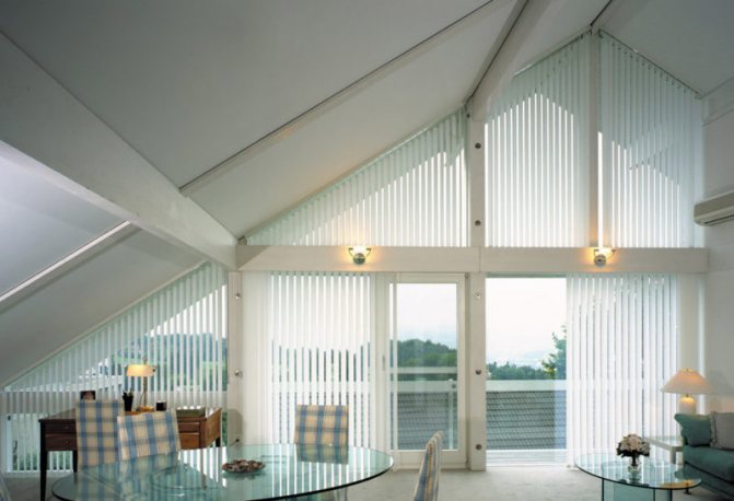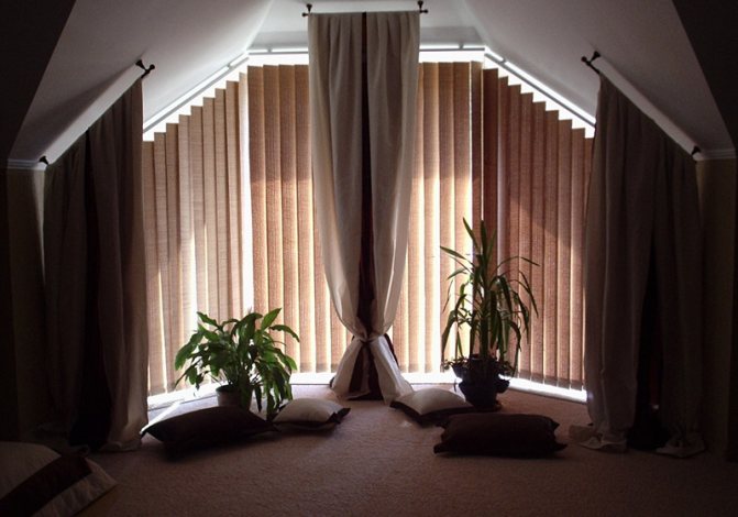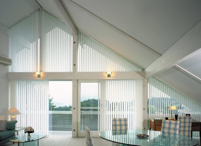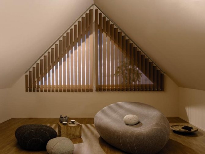 Les stores verticaux sont la deuxième façon la plus populaire de décorer les fenêtres triangulaires après les rideaux. Les ouvertures spacieuses sont le plus souvent décorées avec des stores verticaux en tissu, les petits avec des modèles horizontaux en plastique.