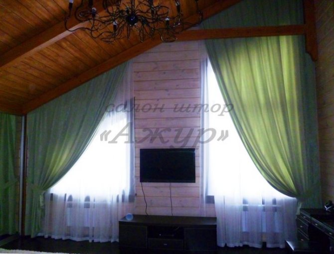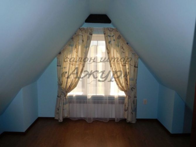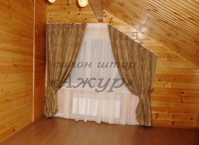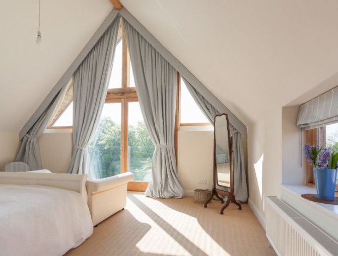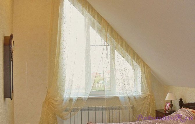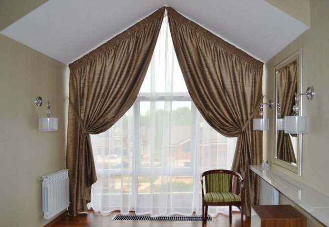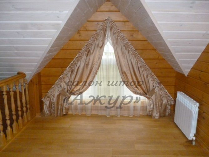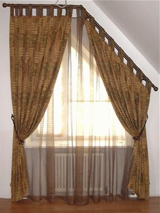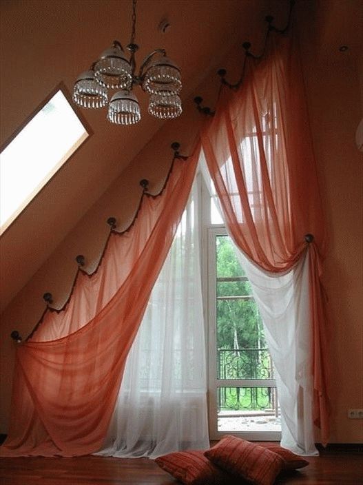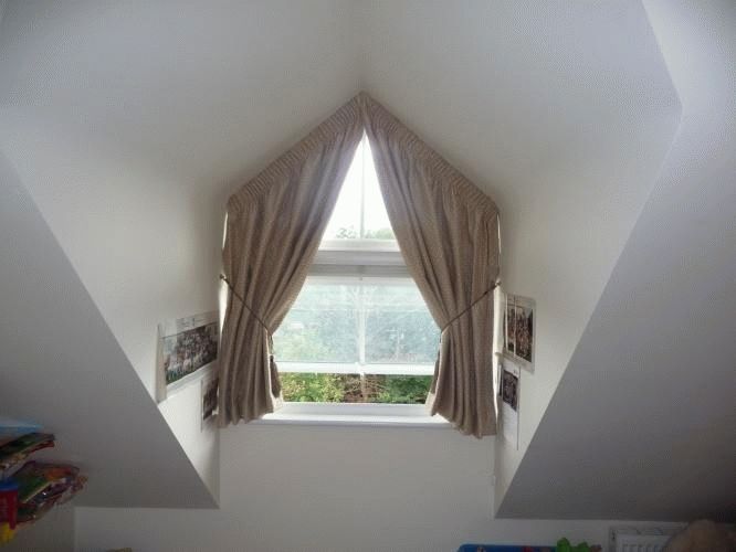 De cette façon, vous pouvez recouvrir la forme de la fenêtre triangulaire en utilisant des doubles rideaux avec un revers, et les rideaux légèrement.