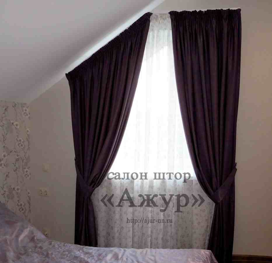 Rideaux avec un lambrequin sur une fenêtre triangulaire angulaire Une méthode similaire, mais sans aucune corniche, consiste à fixer des porte-points métalliques spéciaux pour œillets à égale distance dans le mur le long de la ligne de l'ouverture de la fenêtre à égale distance et à suspendre les toiles sur eux. Dans ce cas, les œillets peuvent être remplacés par des boucles en tissu ou des attaches, s'ils s'intègrent à l'intérieur.