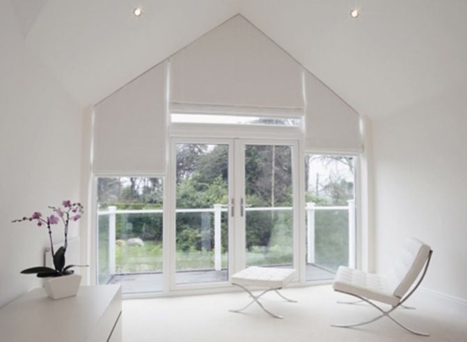 Ils ne s'ouvriront pas jusqu'au bout sur une ouverture non standard. Si sa forme est complètement triangulaire, il ne sera possible de fixer le modèle de rouleau de façon permanente. Il est plus pratique de «casser» l'ouverture en forme de maison en plusieurs parties. Fermez la section triangulaire avec un volet roulant en tissu qui coïncide avec lui le long du contour et décorez la section rectangulaire avec un volet roulant standard. Une autre option consiste à suspendre les stores enrouleurs sur la partie rectangulaire du cadre et à ne pas décorer le dessus.