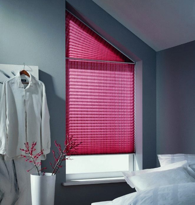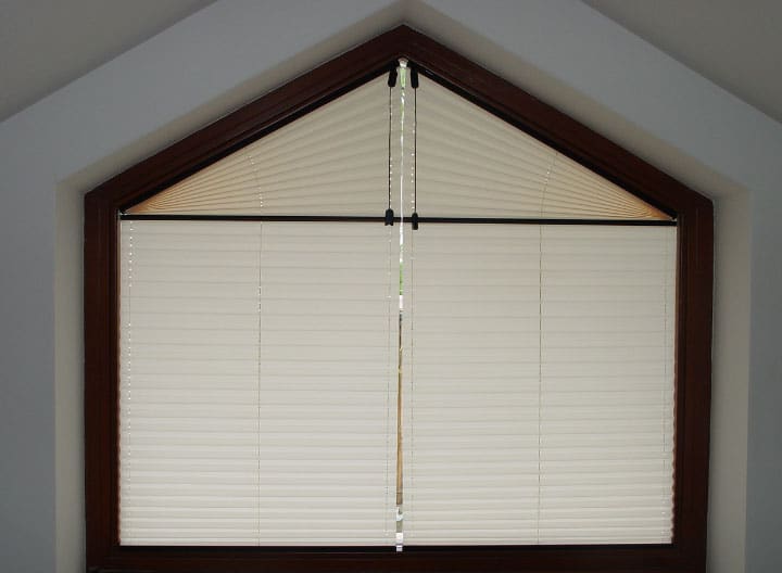 Sur une fenêtre triangulaire, les stores plissés peuvent être suspendus de manière radiale, à partir du centre, créant les intentions d'un symbole solaire à l'intérieur
