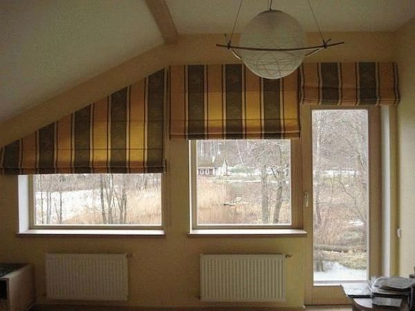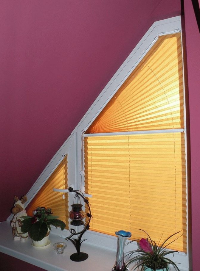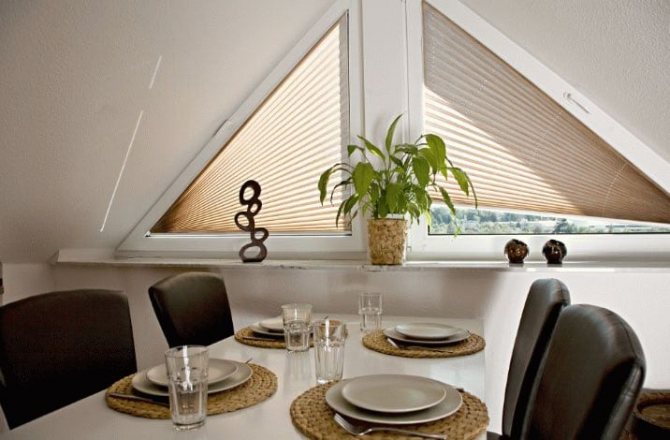 Parmi les fenêtres non standard, il y a pas mal de fenêtres de forme triangulaire. Ils sont surtout souvent installés dans les greniers. Les plus acceptables ici seront les rideaux classiques, les stores plissés et les stores. Chaque type de rideau a ses propres caractéristiques, qu'il est important de prendre en compte lors de leur installation.