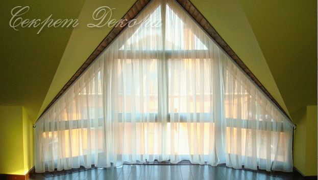 Peut-être que nous bouleverserons un peu les amateurs d'options budgétaires - pour être bon marché et joyeux. Dans le cas de telles ouvertures de fenêtre non standard, cette option est pratiquement exclue. Parce qu'il est impossible d'acheter des rideaux pour fenêtres triangulaires prêtes à l'emploi: il est impératif de prendre en compte les paramètres spécifiques de ces mêmes fenêtres.