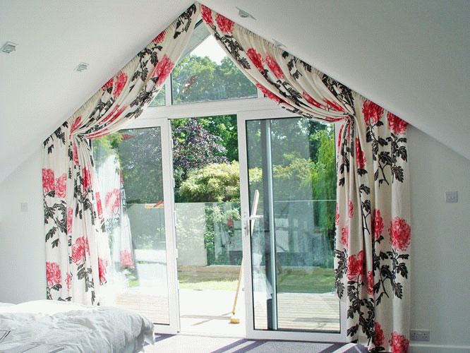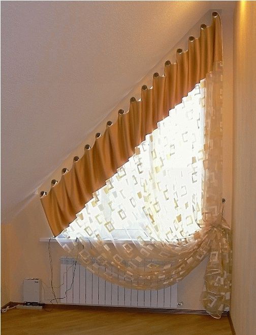 Informations Complémentaires. Pour ceux qui n'ont pas l'habileté de coudre, il est assez difficile de fabriquer un rideau pour une fenêtre triangulaire de vos propres mains; l'aide à cet égard sera fournie par des photos et des classes de maître. Des recommandations sur la façon de coudre un rideau oblique sur une fenêtre, ainsi que des patrons et des schémas de couture, peuvent être trouvées sur Internet.