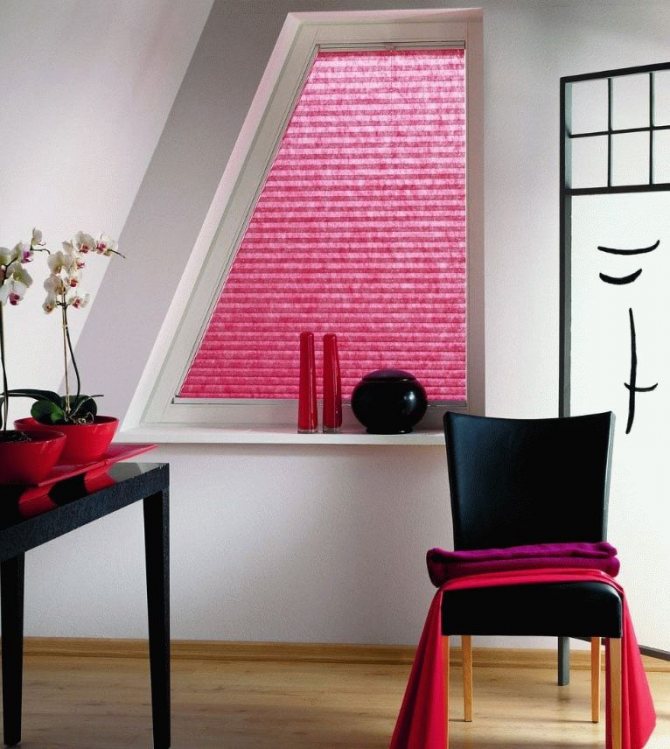 - Les caractéristiques de l'installation des stores dépendent des caractéristiques des fenêtres triangulaires. Les larges sont pratiques à fermer avec des rideaux verticaux en tissu. Une petite fenêtre paraîtra visuellement plus large si des stores horizontaux en PVC sont utilisés pour la décorer. La règle générale est de prendre en compte les dimensions et la géométrie de la structure.