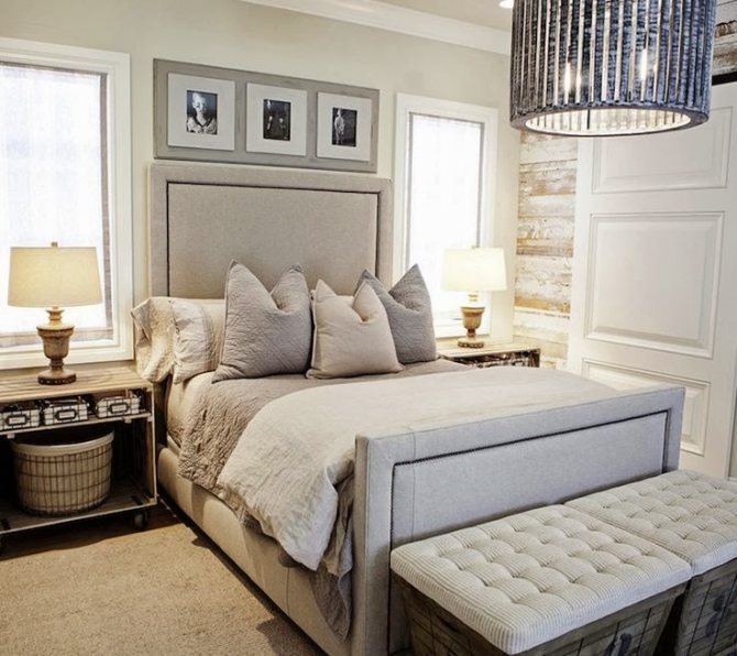 Les canapés sont inconfortables, la posture se détériore et le dos fait mal. Le lit doit être placé même dans les petites chambres. Vous pouvez économiser de l'espace libre et non sur votre colonne vertébrale.Il est préférable d'installer le lit de manière à ce que la lumière des fenêtres tombe sur le côté. Si la surface de la pièce le permet, vous pouvez mettre un petit canapé, une table basse ou un fauteuil poire près des fenêtres.