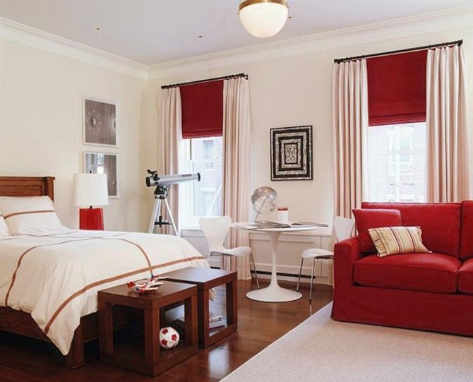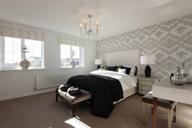 En quête de choquant, n'oubliez pas qu'une chambre, même avec deux fenêtres, est un lieu de détente et de repos. Des mélanges de couleurs chaudes et neutres conviennent mieux à son agencement. vous pouvez utiliser le rouge, le gris, le blanc, le marron, le jaune, le beige et d'autres couleurs. Une combinaison de moderne et d'antiquité est également acceptable dans le cadre. Le confort apportera avec eux: cheminée, moquette moelleuse, mobilier confortable.