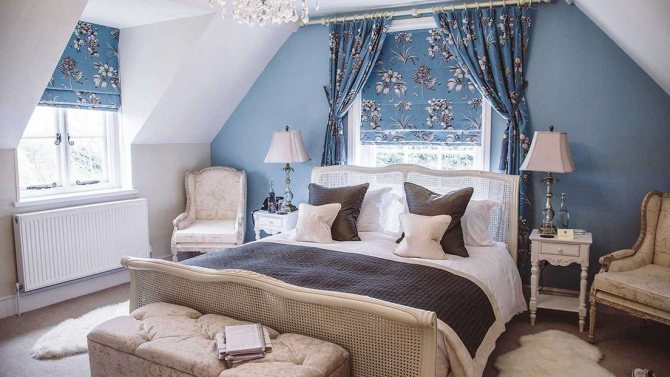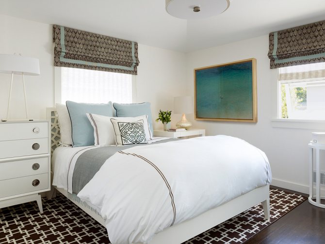 La présence de deux fenêtres dans la pièce compliquera la tâche de choix d'une palette de couleurs. Dans une pièce très lumineuse, toutes les nuances ne seront pas harmonieuses. Une luminosité excessive des couleurs entraînera une irritabilité. Cet effet sera particulièrement prononcé pendant la journée. Non pertinent pour la décoration intérieure d'une chambre avec deux fenêtres et des stores clairs. La lumière excessive doit être atténuée. En option, il convient de considérer: