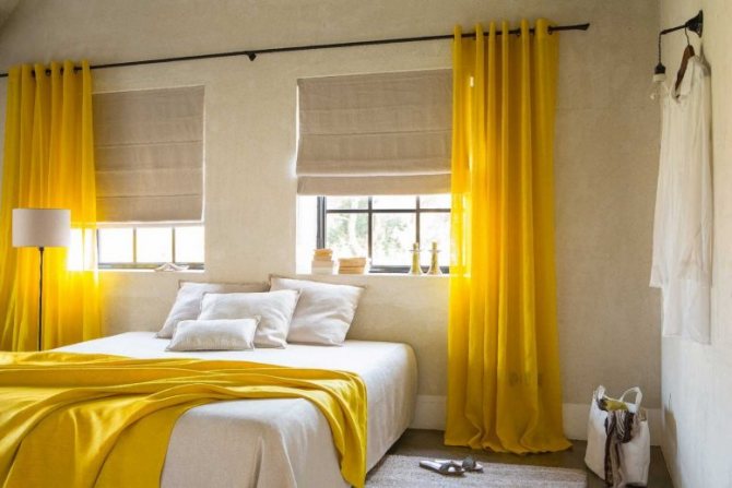 Le confort dans une chambre avec deux fenêtres apporte traditionnellement le crépuscule, la tâche principale des rideaux utilisés sera donc de le fournir. Leur poids et leur obscurité dépendent du degré d'illumination de l'espace, c'est-à-dire de l'endroit où les ouvertures des fenêtres «regardent» par rapport aux points cardinaux.