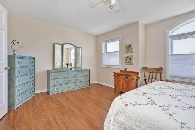 Si les ouvertures de fenêtre sont situées sur le même mur, une bibliothèque, un miroir pleine longueur ou un meuble de télévision peuvent s'insérer entre eux. L'un des murs de la pièce doit être occupé par une armoire. Il est préférable de l'organiser dans le même style que le lit. Dans les grandes chambres spacieuses, à côté des fenêtres, vous pouvez concevoir un espace de travail avec un bureau d'ordinateur et une chaise sur roulettes. Une étagère avec des livres peut également être installée entre les ouvertures des fenêtres.