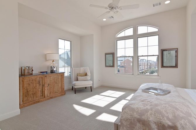 Beaucoup de lumière naturelle est toujours bonne, mais une chambre à coucher est synonyme de détente et de tranquillité, que la lumière peut parfois gêner. L'emplacement des meubles et le choix des textiles dépendent en grande partie des options de disposition et de l'emplacement des fenêtres. Parmi les caractéristiques de ces locaux figurent: