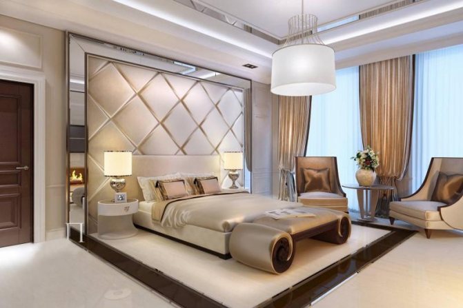 Les styles du passé seront également intéressants dans la conception d'une chambre à coucher avec deux fenêtres. Ici, il est tout à fait possible de reproduire l'Empire, le Rococo, le Baroque. De lourds rideaux avec des draperies, un lustre massif, des meubles aux façades sculptées et incrustées - tout cela nécessitera de l'espace et une abondance de lumière. L'ambiance est riche et calme. Une telle pièce veut plonger dans les vagues du luxe et tout oublier.