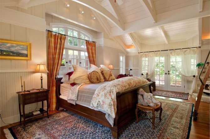 Le décor traditionnellement oriental se caractérise par une débauche de couleurs, des matériaux de finition naturels, des meubles bas et luxueux, une abondance d'oreillers et de tapis. Les ornements doivent être présents dans la conception d'une chambre à coucher avec deux fenêtres. Ils peuvent décorer des textiles ou des meubles.