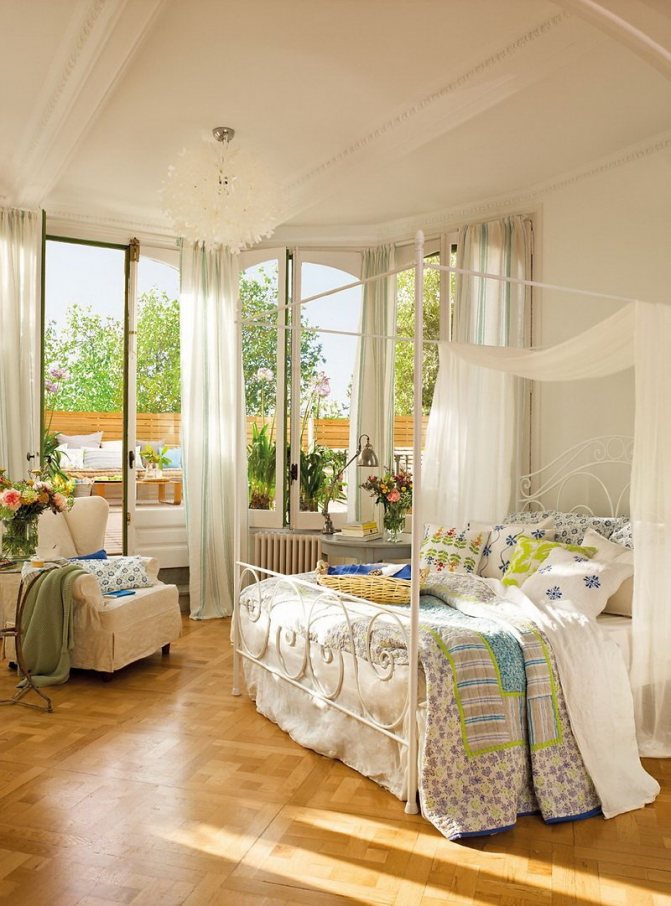 La chambre dans cette interprétation a l'air légèrement vintage. Les meubles semblent quelque peu démodés, mais en même temps n'ont pas perdu leur élégance. La palette de couleurs est calme, souvent une combinaison de peinture blanche, lilas et bleue.