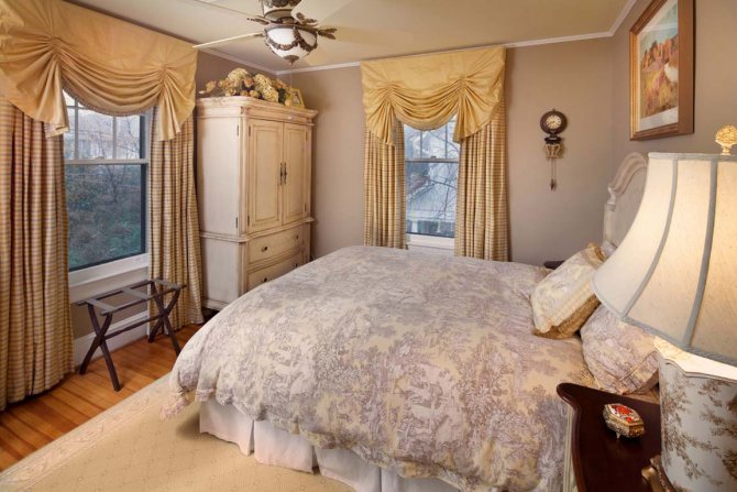 Le mobilier et la décoration se distinguent par leur élégance. La finition discrète est laconique. Dans l'aménagement intérieur d'une chambre à deux fenêtres, la préférence est donnée aux couleurs douces et calmes. Il peut s'agir de la couleur du lait cuit au four, de l'ivoire, de la pistache, du lilas, des nuances de moutarde et d'autres représentants du spectre pastel.