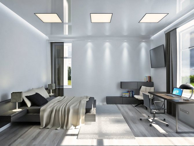 Plein de lumière accentue chaque détail de la pièce. Pour cette raison, il est préférable de rester avec des options simples qui ne nécessitent pas de finition complexe. Il vaut mieux refuser le zonage. Les sols lisses et les plafonds sans marches en forme de marches sont la meilleure solution.