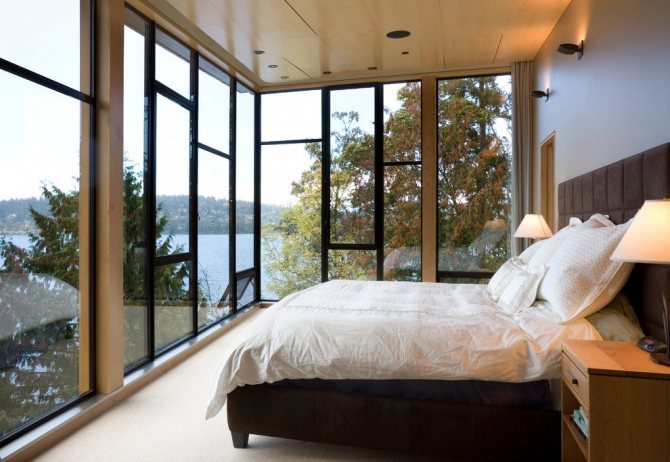 - Il y aura toujours beaucoup de lumière dans la pièce, surtout si les fenêtres donnent sur le côté ensoleillé. Cependant, les rayons du soleil interfèrent avec le sommeil et la relaxation saine. Ce problème peut être résolu par une disposition réfléchie du lit, des rideaux ou des stores spéciaux, un saupoudrage sur les fenêtres, du verre teinté.