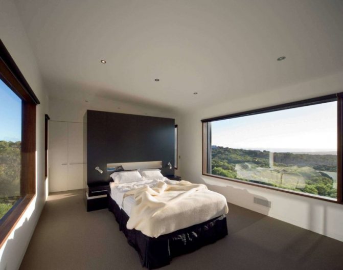 Abordez le choix de la décoration de la chambre avec soin. Gardez à l'esprit que les matériaux utilisés dans la décoration intérieure de la chambre à coucher avec deux fenêtres sont la clé de l'atmosphère future. Pour la romance, concentrez-vous sur les surfaces douces. Pour un environnement strict et solide, vous aurez besoin d'un stratifié, de poutres au plafond, de maçonnerie nue, d'une abondance de structures métalliques. Les surfaces en verre et en bois aideront à remplir l'espace d'air et à le rendre léger.