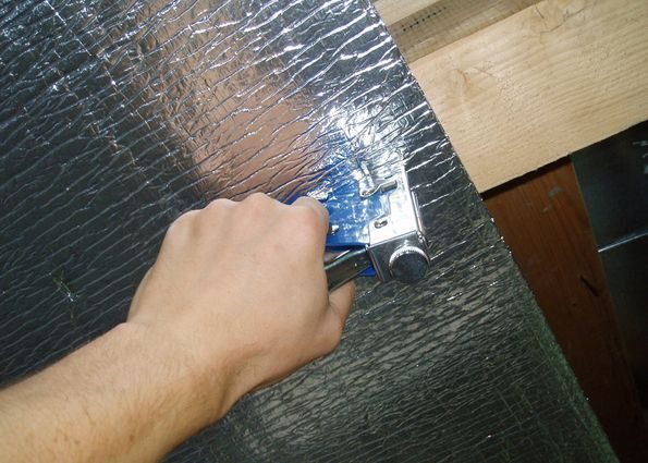 • Le matériau en feuille est recouvert de papier d'aluminium à l'intérieur de la pièce. La fixation sur une surface en bois est réalisée à l'aide de supports de construction.