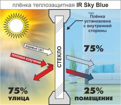 Par rapport aux homologues de protection solaire, les films de protection thermique sont plus efficaces, ils créent une barrière au spectre thermique (infrarouge) du rayonnement solaire, à l'exclusion de la surchauffe de l'appartement. Pour refléter l'énergie thermique du soleil, des matériaux de protection thermique sont utilisés sur les fenêtres des maisons privées, des bureaux, des fenêtres panoramiques, des verrières.