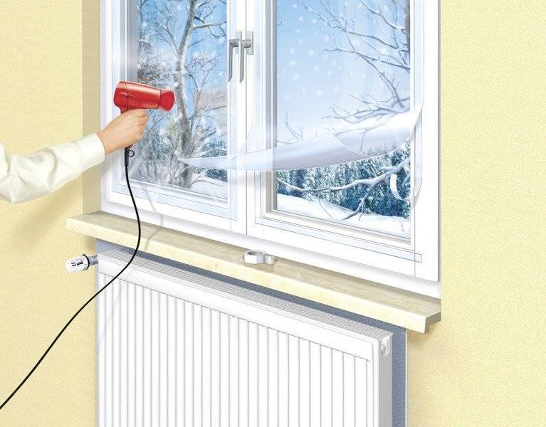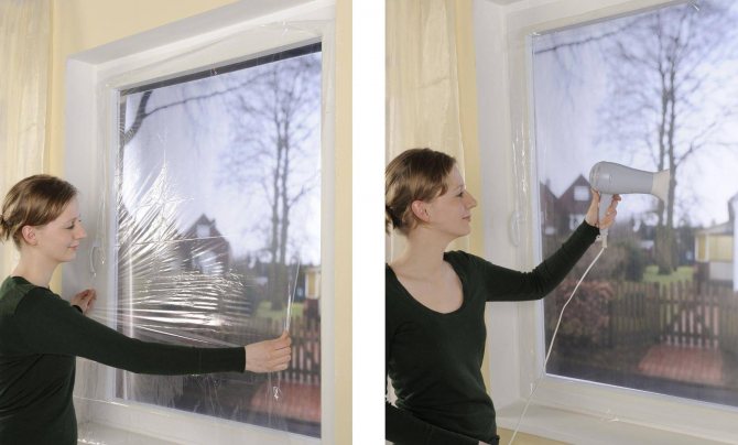 Au départ, le film rétractable ressemble à un sac en plastique affaissé - il est suspendu au cadre de la fenêtre, ne différant pas par son apparence normale. La situation est facile à résoudre - nous prenons une construction ou un sèche-cheveux ordinaire dans nos mains, l'allumons en mode chauffage, dirigons un flux d'air chaud sur la surface du film. Sous l'influence de la chaleur, il se lissera et prendra un aspect normal. Si un segment se casse ou devient inutilisable, il peut être facilement remplacé.