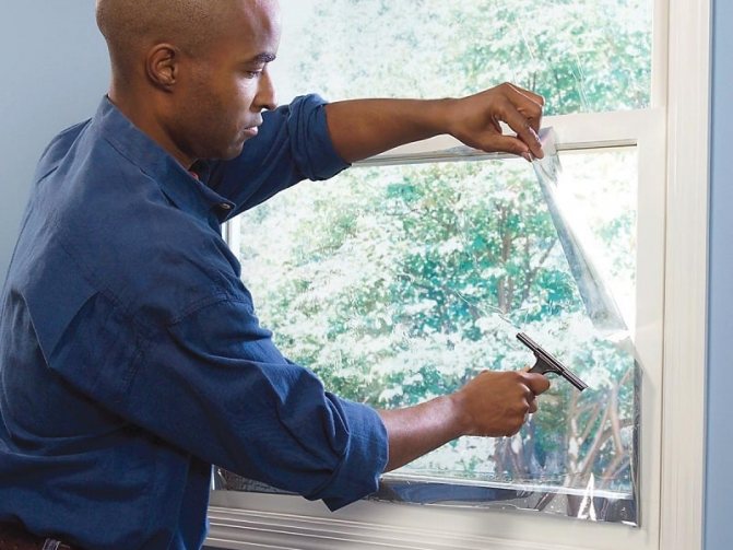 - Collez le film d'économie de chaleur sur le verre, appuyez vers le bas, expulsez les bulles d'air avec des moyens improvisés (vous pouvez utiliser les outils pour lisser le papier peint).