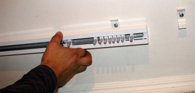 L'emplacement des équerres est déterminé de la même manière qu'avec un plafond en béton, mais en tenant compte des guides (choisir perpendiculaire à la fenêtre). Le support est appliqué au point souhaité et tourné. Un clic signifie qu'il est solidement fixé.