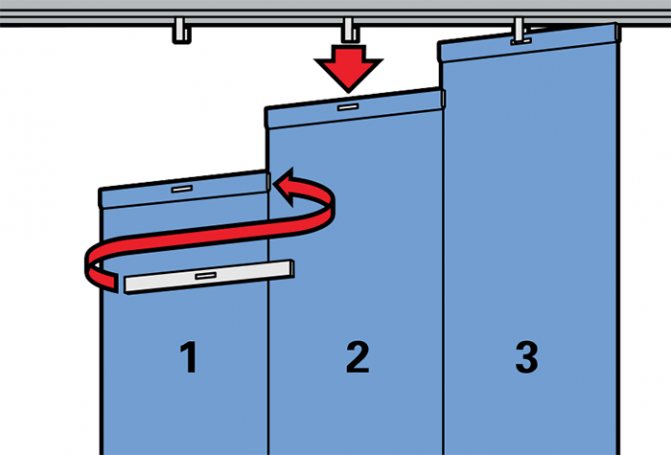 Après cela, des trous sont percés à ces points et des chevilles sont placées sur lesquelles les supports sont montés. Pour empêcher les stores verticaux de basculer avec un courant d'air, des poids sont utilisés sous chaque bande, reliés par une chaîne. Il existe deux modes d'installation à l'extérieur: à l'intérieur de l'ouverture et à l'extérieur (au plafond ou au mur).