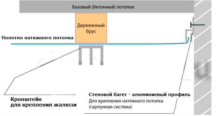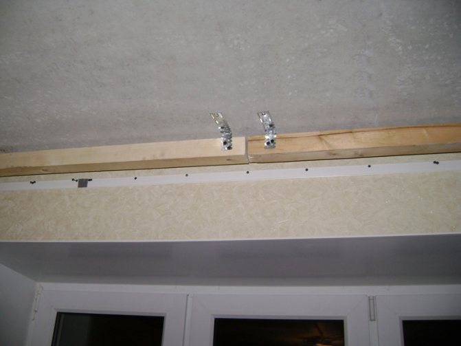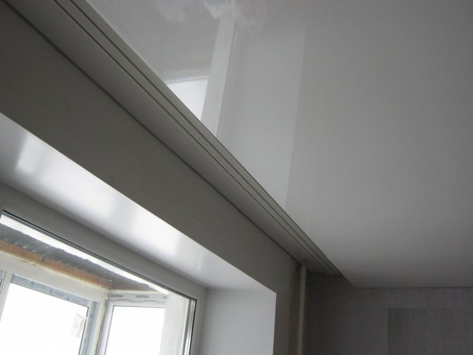 La deuxième méthode vous permet de créer un support caché, dans lequel les stores sont installés dans une niche. Pour ce faire, le plafond n'est pas étiré sur toute la surface, mais se retire du mur extérieur. La distance est faite pour que la corniche s'adapte. À quelques centimètres de la fenêtre, un bois est vissé et des baguettes pour plafond tendu y sont fixées. La hauteur est calculée au ras des profils sur les murs.