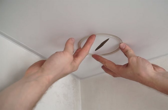 Après avoir installé le plafond tendu, recherchez l'emplacement de la poutre. Les loquets de la corniche sont montés sur des vis autotaraudeuses, qui sont vissées dans l'arbre sans chevilles. La toile doit d'abord être renforcée - collez des morceaux de ruban renforcé ou de petits anneaux de protection afin que le trou ne se disperse pas de la tension.
