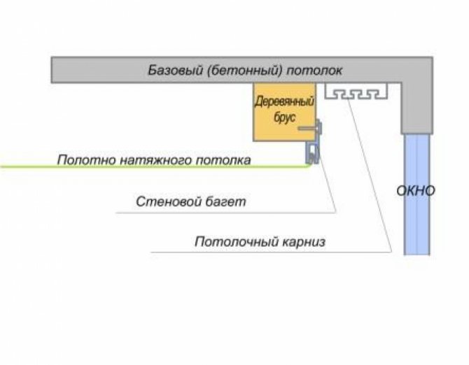 La poutre est installée à l'endroit où il est prévu d'accrocher la corniche. La hauteur est calculée de manière à ce que l'arête touche le plafond tendu. Une poutre trop grande dépassera, et à partir d'une petite, la toile sera tirée et des plis peuvent se former.