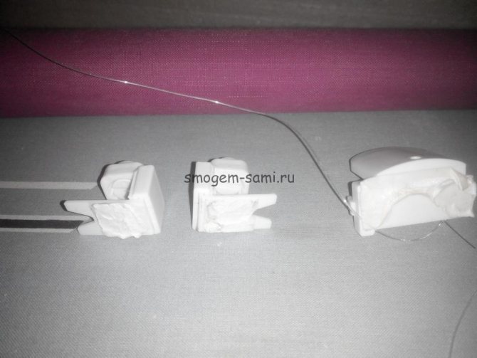 - Si le modèle est avec une ligne de guidage, passez les extrémités de la ligne à travers les trous des supports, nouez avec un double nœud, coupez exactement au milieu.