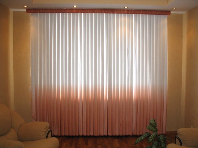 Examinons de plus près le fonctionnement des stores verticaux. Dans la partie inférieure des lamelles, des poids spéciaux sont utilisés pour assurer une position équilibrée et éviter le balancement. Une chaîne de contrôle spéciale leur permet de les faire pivoter à 180 degrés. L'assemblage et le déploiement sont effectués à l'aide d'un cordon de commande. Les lamelles en plastique ou en tissu peuvent être de différentes largeurs. Un modèle spécifique doit être sélectionné en tenant compte des dimensions de la fenêtre. Pour les petites options, il est préférable d'acheter des stores avec des rayures étroites, et pour les grands - avec des larges.