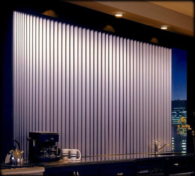 - Sortir la pièce. Lors de l'installation de stores verticaux, vous pouvez augmenter visuellement la hauteur des plafonds, car les lamelles contribuent à l'impression que la zone de la fenêtre est devenue plus élevée.